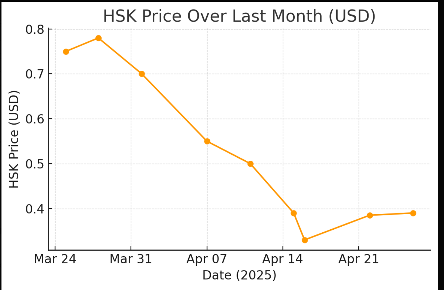 최근 한 달 동안 홍콩 해시키(HashKey) 거래소의 플랫폼 토큰인 HSK 가격이 큰 폭으로 하락했습니다. 3월 말 약 0.75달러 수준이던 HSK 토큰 가격은 4월 중순경 0.33달러 선까지 떨어지며 사상 최저치를 기록했는데요. 아래 차트는 3월 말부터 4월 말까지 HSK 가격 추이를 보여주고 있으며, 이 기간 동안 초반의 완만한 하락이 4월 초~중순에 급격한 하락으로 이어졌음을 알 수 있습니다. 이번 글에서는 투자자 심리, 거래소 이슈, 시장 전반 분위기 등 세 가지 관점에서 이러한 하락의 원인을 쉽게 풀어서 살펴보겠습니다. 투자자 심리: 커뮤니티 우려와 신뢰 약화HSK 가격 급락의 가장 직접적인 배경에는 투자자들의 심리 위축이 있었습니다. 해시키 토큰 보유자 커뮤니티에서는 HSK 토큰의 “바이백(..