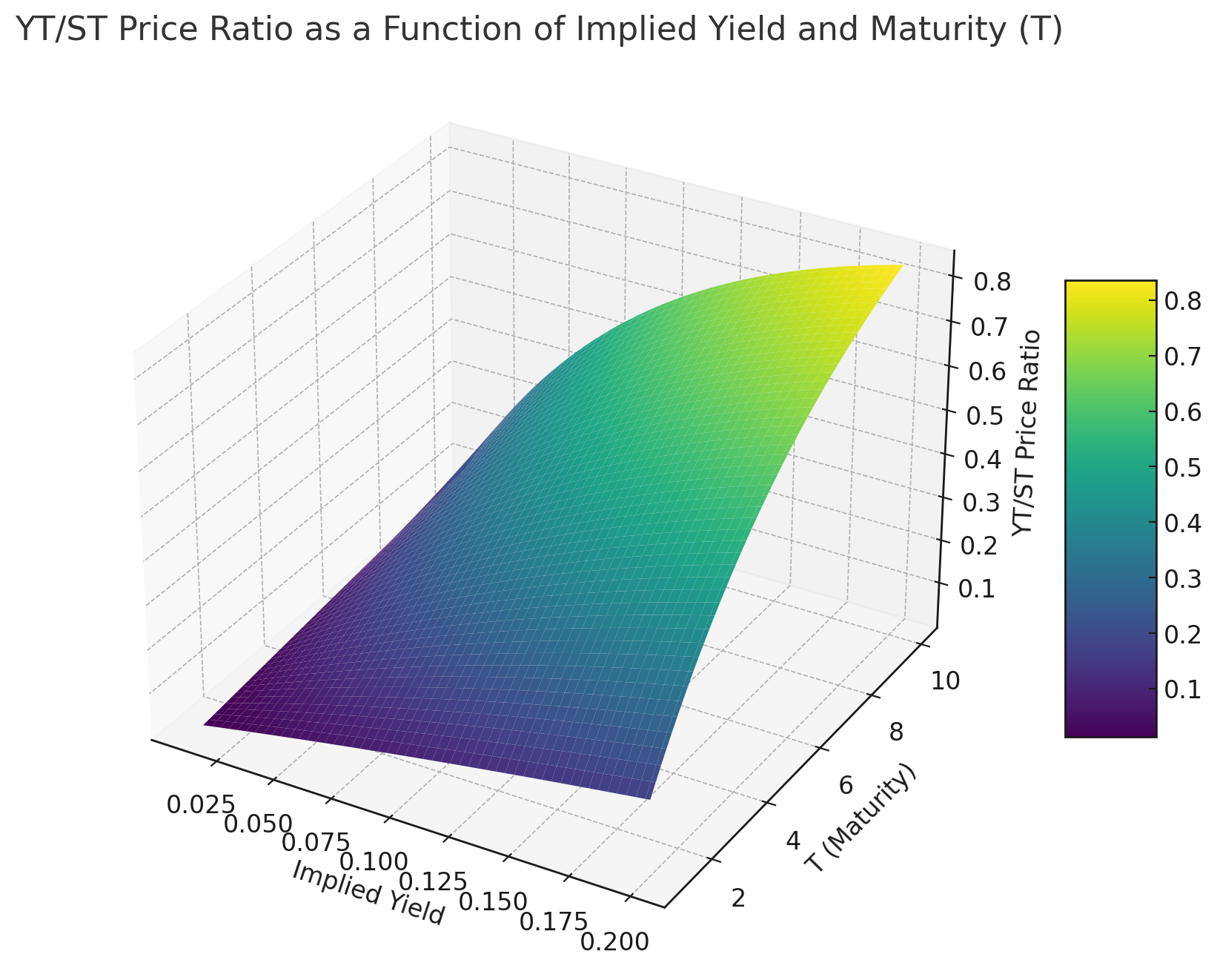만기까지의 시간이 고정되어 있다면, YT와 ST의 가격 비율은 암시적 수익률의 단일 변수 함수로 표현될 수 있습니다. 이 관계는 암시적 수익률이 YT/ST 가격 비율에 직접적인 영향을 미치며, 이를 결정하는 유일한 요인임을 강조합니다.