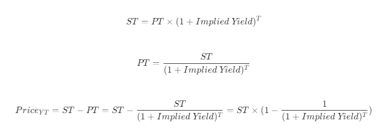 YT의 가치를 평가하는 핵심 변수는 **암시적 수익률(Implied Yield)**입니다. 암시적 수익률은 해당 **PT(Principal Token)**을 만기까지 보유했을 때 기대되는 수익을 나타냅니다.
