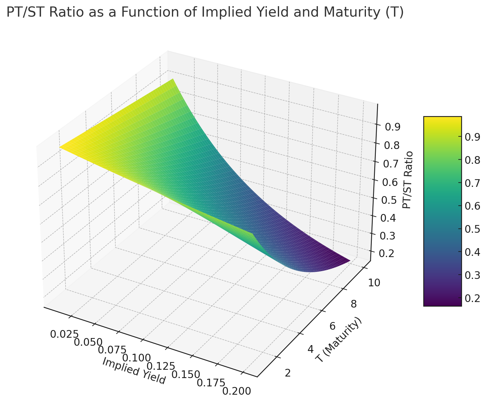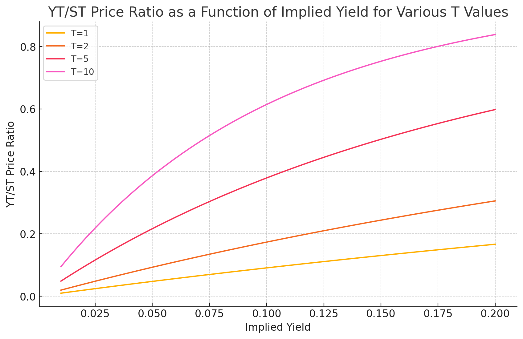 만기까지의 시간이 고정되어 있다면, YT와 ST의 가격 비율은 암시적 수익률의 단일 변수 함수로 표현될 수 있습니다. 이 관계는 암시적 수익률이 YT/ST 가격 비율에 직접적인 영향을 미치며, 이를 결정하는 유일한 요인임을 강조합니다.