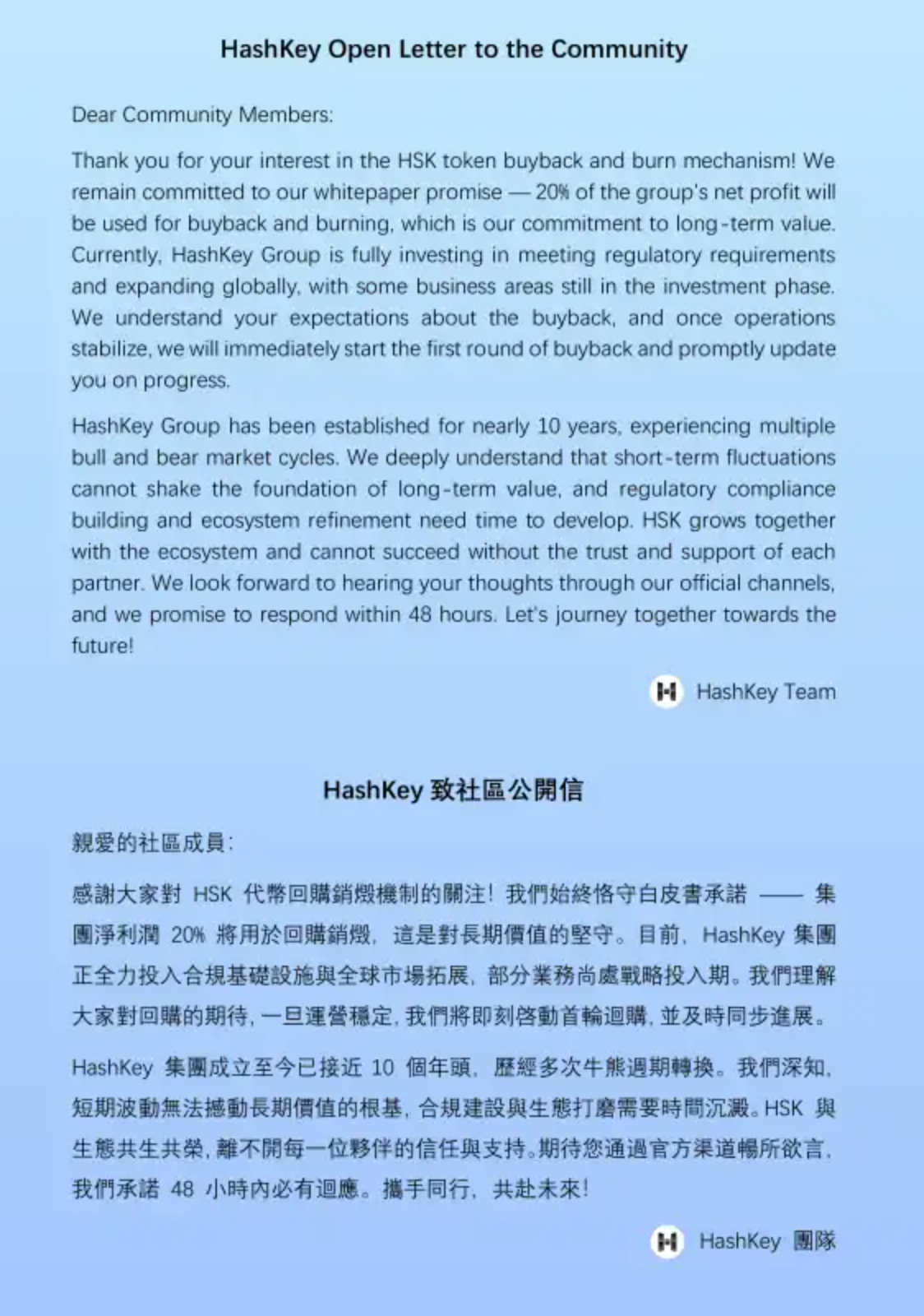 앞서 언급한 바이백 지연에 대해 해시키 그룹은 4월 15일 공개 서한을 통해 해명을 내놓았는데요. “현재 글로벌 사업 확장 및 규제 요건 충족을 위해 투자를 진행 중이며 일부 사업은 아직 투자 단계에 있다”며, 운영이 안정되는 대로 첫 번째 HSK 바이백을 실시하고 진행 상황을 공유하겠다고 밝혔습니다.