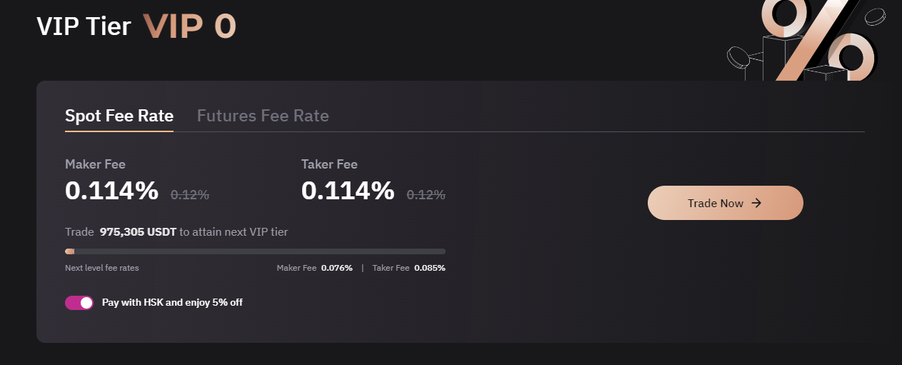 우선 VIP 레벨 페이지(VIP Level Page)에서 HSK 수수료 차감 기능을 ‘수동으로’ 활성화하실 수 있습니다. 이 기능을 켜두면, 스팟 거래 시 발생하는 수수료를 HSK로 지급하게 되며, 5% 할인된 수수료율을 적용받을 수 있습니다. 단, 차감 대상은 스팟 거래 수수료에 한정되며, 입출금 수수료나 기타 서비스 수수료에는 적용되지 않습니다.