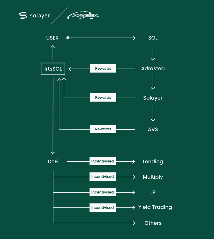 Solayer와 Adrastea는 Liquid Restaking을 통해 기존 Restaking 방식을 유동적으로 개선했습니다. 이 과정에서 Adrastea는 Solayer의 아키텍처를 활용하여 유동성을 최적화된 AVS에 위임하고, 사용자는 lrtsSOL(Liquid Restaking Token)을 통해 추가 보상을 받을 수 있습니다.